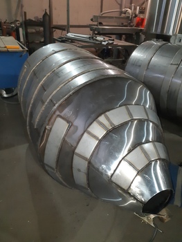 Ціліндро конічний танк має сорочку охолодження, виконану у формі спіралі, що дозволяє підтримувати температуру в ємності відповідно до заданих параметрах. Сварка сорочки виконується аргоном, перевіряється на герметичність і повинна витримувати тиск, з яким подається хладоген. Сорочка охолодження обичайки і конуса може мати загальне і роздільне підключення для циркуляції охолоджуючої рідини. |