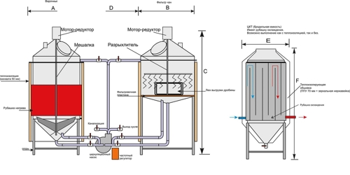 Фильтрационный чан оборудован оросительным контуром для промывки дробины, мотор-редуктором с разрыхлителем дробины, регулировкой оборотов разрыхлителя (опция), смотровым люком, подсветкой внутри чана, моющей головкой с подключением к СИП-мойке, боковым люком для выгрузки дробины.