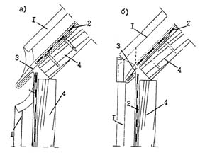а) 1 - стоячий фальц со скошенными кромками; 2 - лежачий фальц со сплошным кляммером; 3 - карнизный свес; 4 - фальцевая медная кровля; 5 - подстилающий слой; 6 - основание под кровлю.